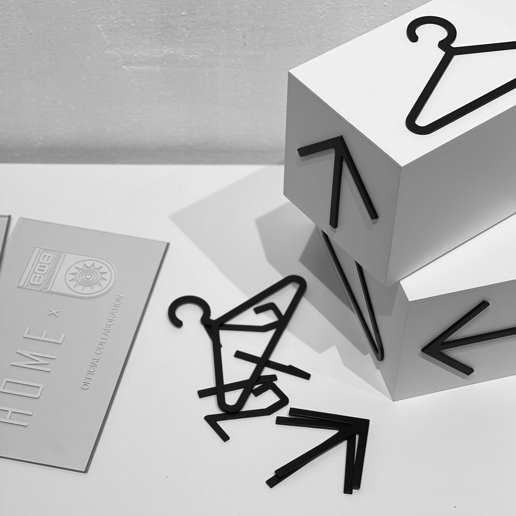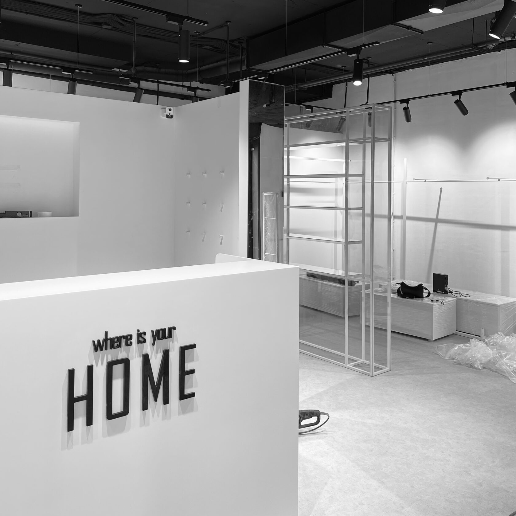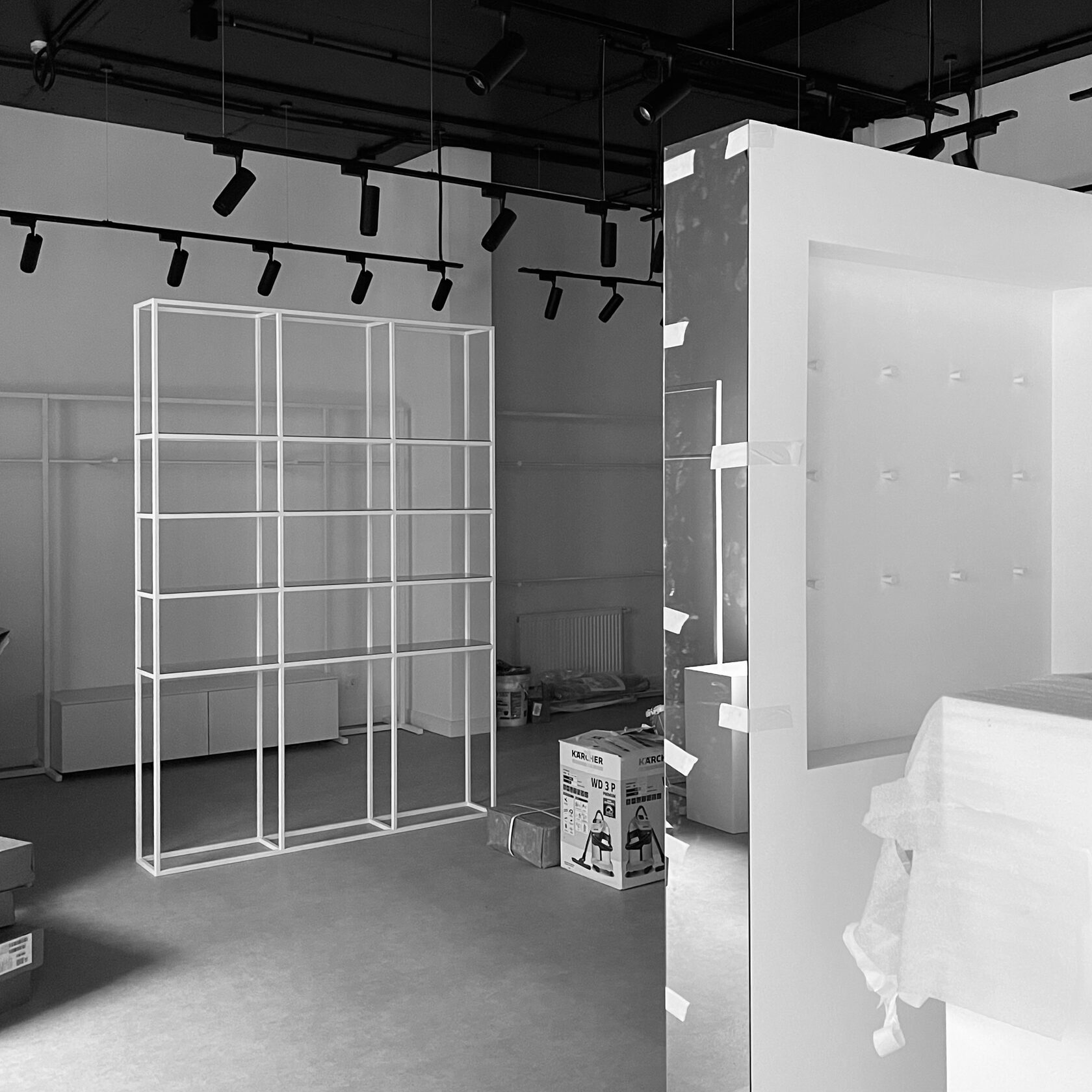 The concept of this interior is minimalism with bold accents. To showcase the clothing attractively in the store, we painted the walls and rails white, and the ceiling black, which helped hide the electrical wiring on the ceiling.