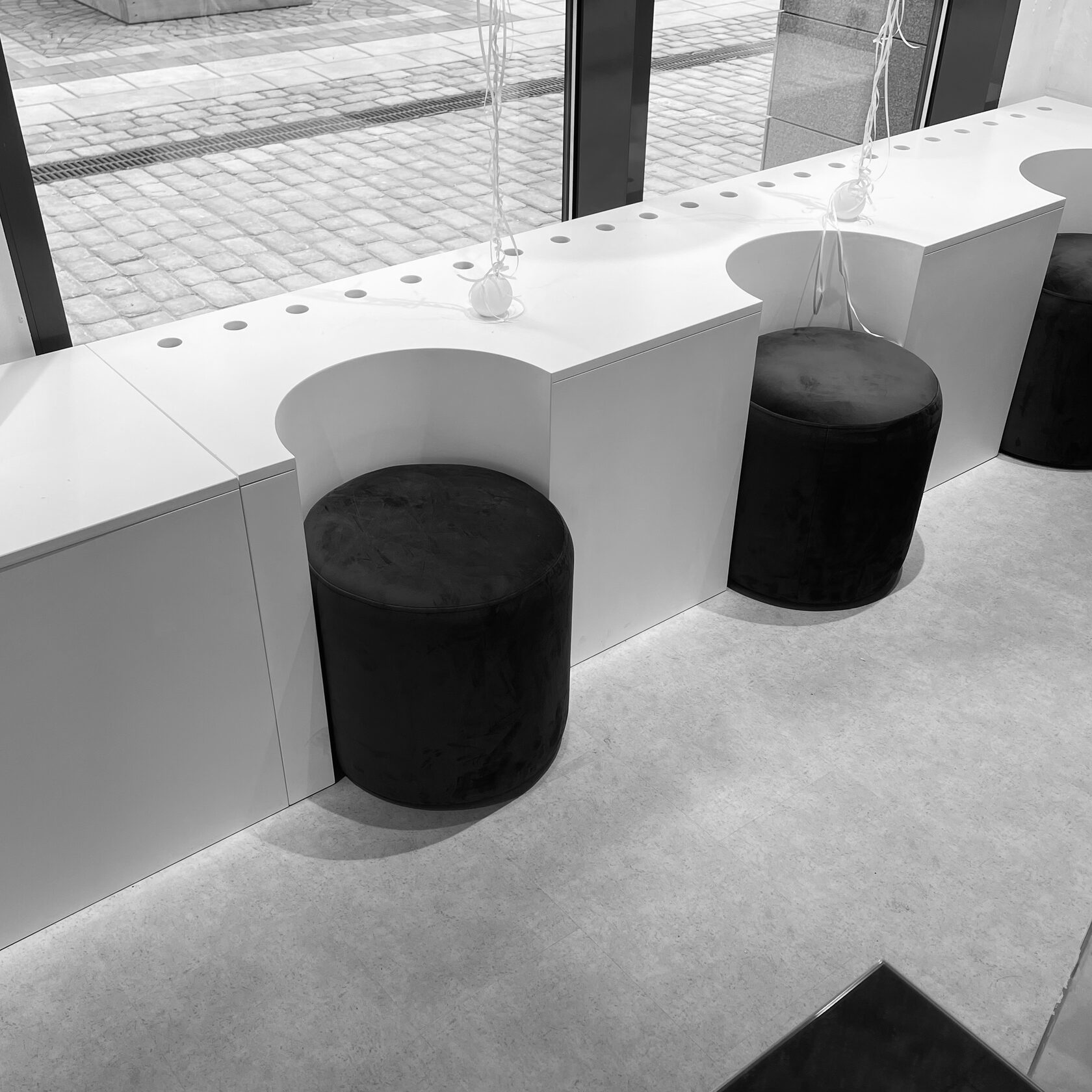 The waiting area made of MDF, with poufs, was positioned near the panoramic windows, effectively concealing the unattractive floor radiators that couldn’t be replaced.