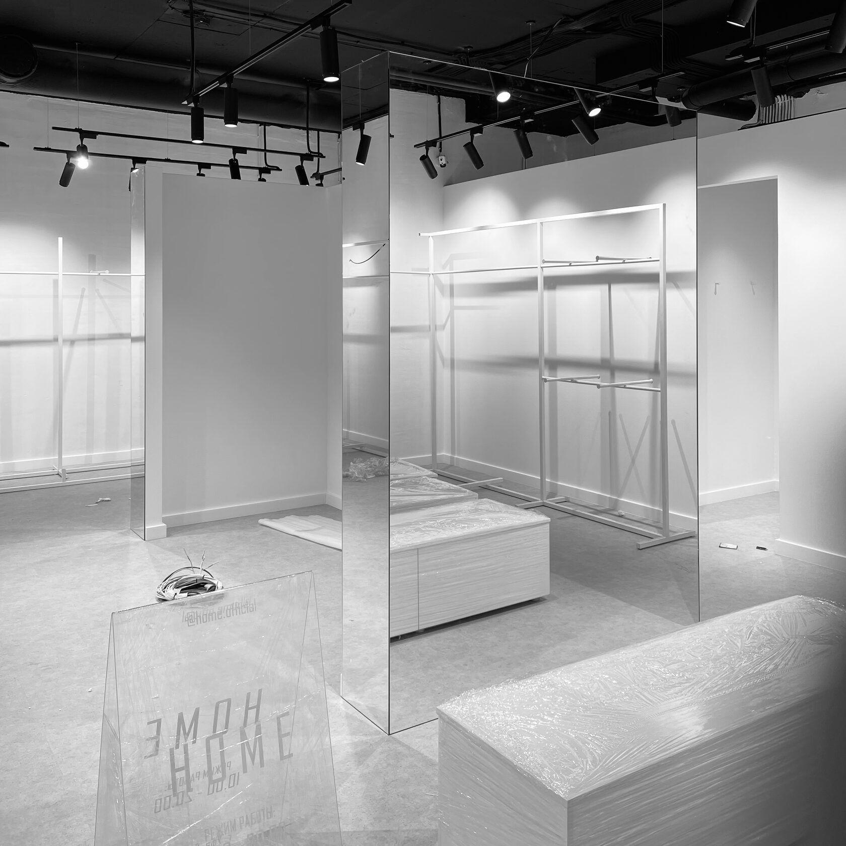 For the accent material, we chose transparent bright acrylic, which was used to create exhibition cubes and shelves for headwear, made according to our drawings. We positioned a mirrored 'cube' with a reception area in the center of the retail space. The cube is made of drywall and covered with mirrors, allowing it to 'dissolve' into the surroundings. This solution served a functional purpose as well, with the mirrors facing the fitting rooms and each side of the retail space.