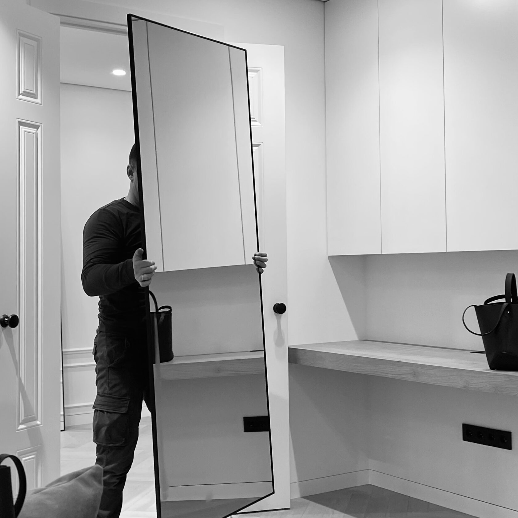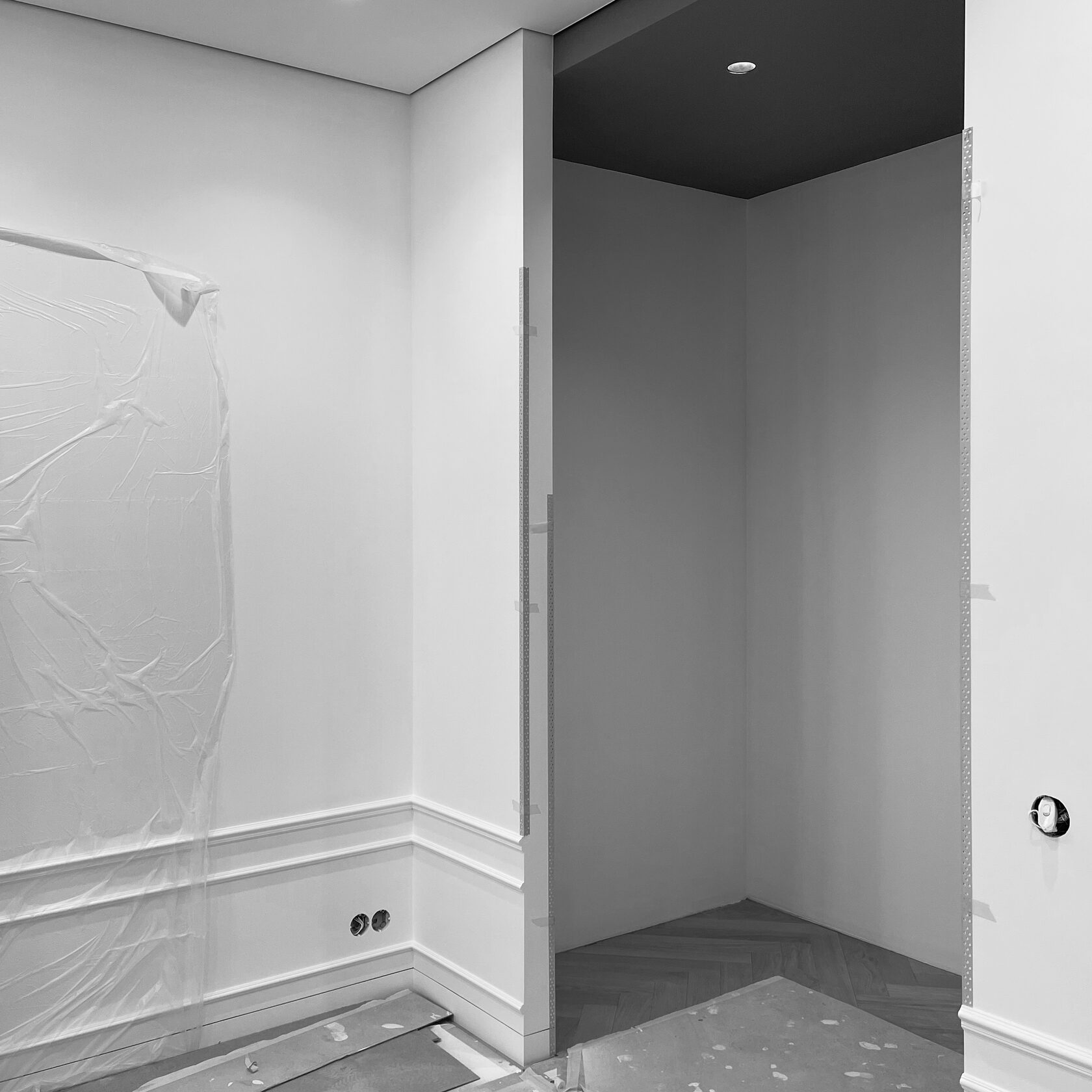 Высокую распашную дверь мы акцентно установили между спальней и гостиной. И чтобы поддержать стилистику двери добавили классические элементы в спальню, получив гармоничный микс классики и минимализма. Зону гардеробной в спальне мы выделили пыльно-зелёным цветом, не отгораживая дверью, что сохранило нам общую площадь комнаты, визуально отделив зону шкафов.