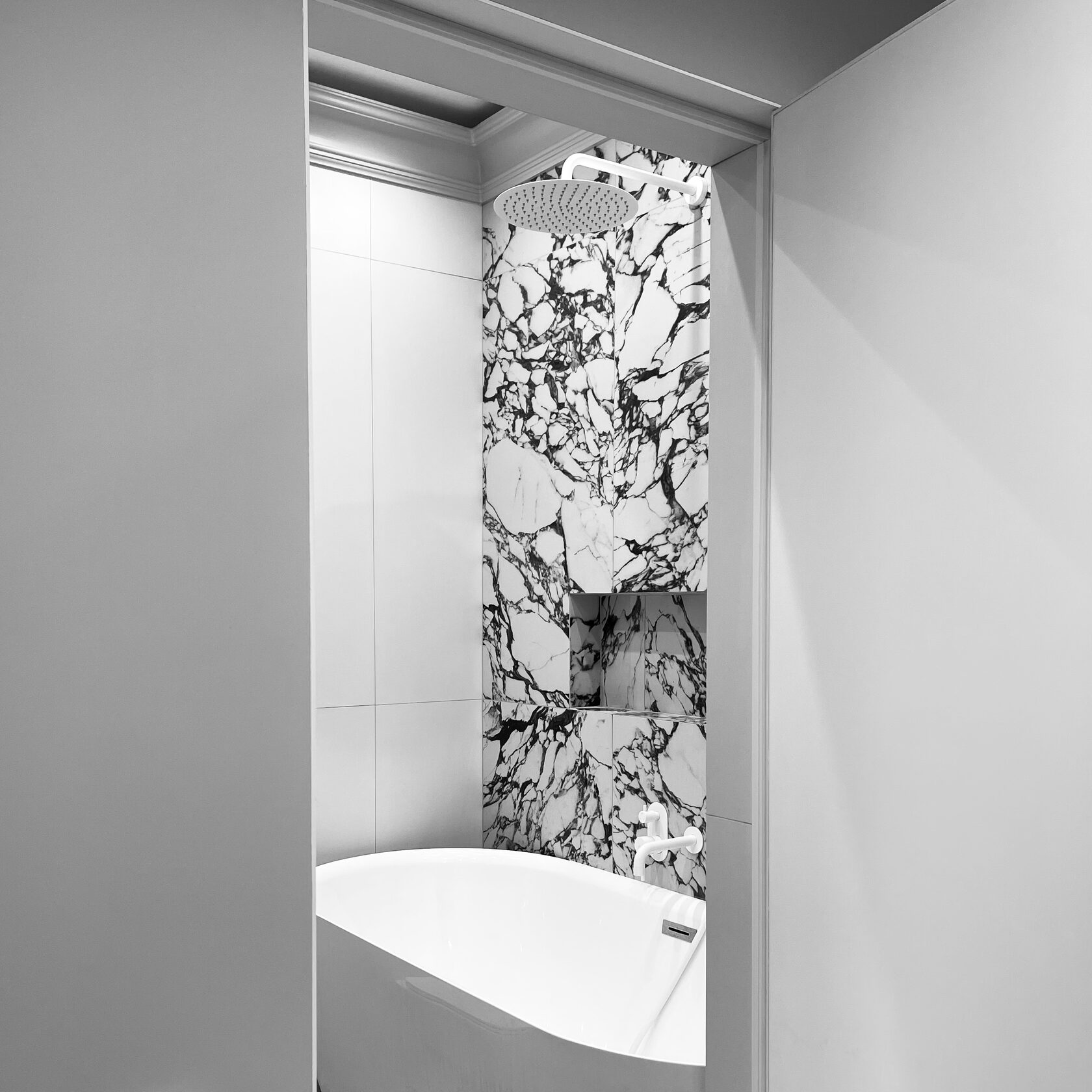 Given the apartment’s compact size of just 38 square meters, we focused on maximizing functionality. IIn the kitchen-living area, we placed an island of an unusual shape in a striking blue — the client’s favorite color. The living space features a small sofa and a TV area with a faux fireplace. A distinctive armchair and a stylish table by the panoramic window complete the living area’s aesthetic.