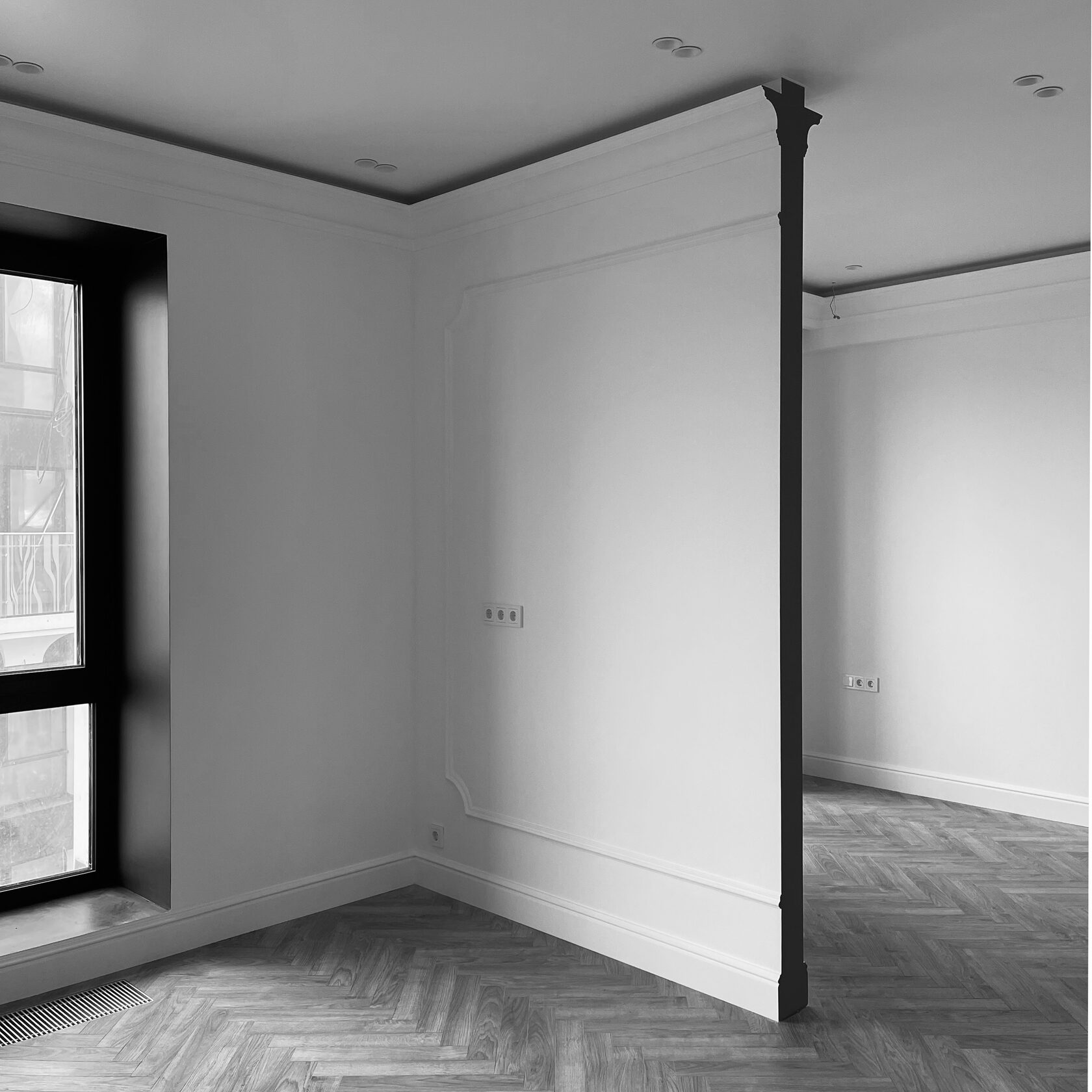 This project stands out for its blend of classic details with futuristically shaped and colored furniture, red interior slopes, conceptual decor, and striking blue accents.